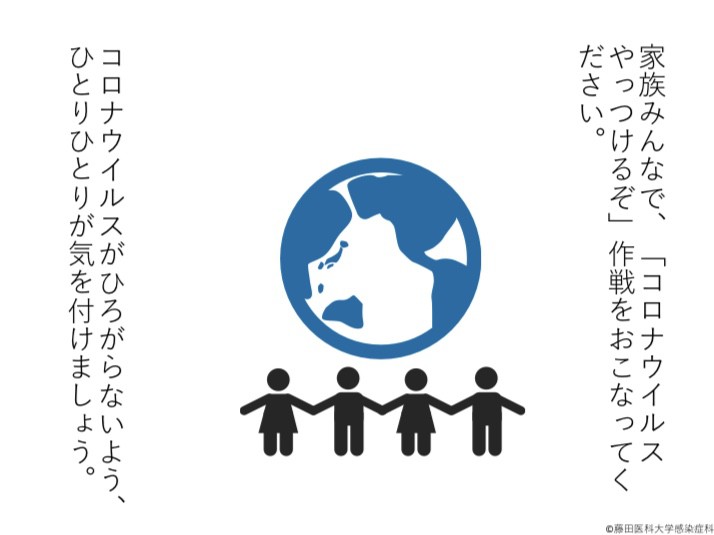 藤田医科大学感染症科の医師が、小さな子どもにも分かる言葉でコロナウイルスについて説明したスライドが分かりやすいと話題になっています。HPで公開されていますので、是非ご家族でご覧ください!